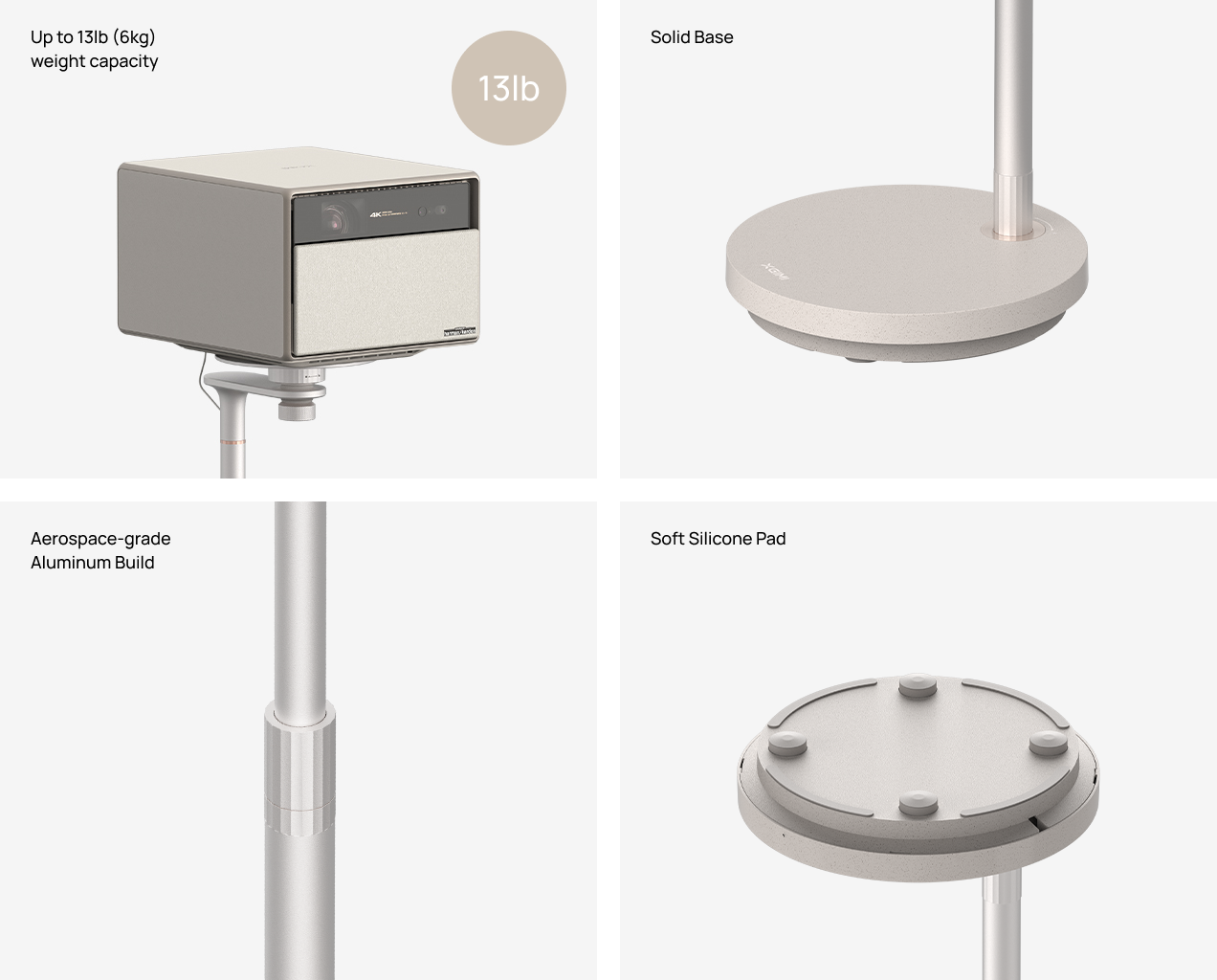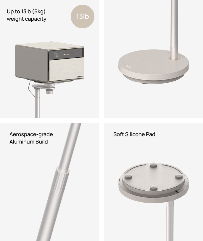 Supports devices weighing up to 13lb. Aerospace-grade aluminum construction with a solid base ensures exceptional stability and long-term durability. A soft silicone pad at the base bottom provides effective slip resistance and shock absorption, preventing floor scratches during movement.